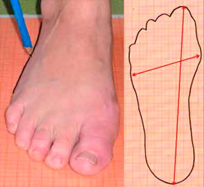 Dibujar en un papel el contorno de cada pie. Es importante estar de pie sobre el papel (el estar sentado modifica la forma de pisar, y la medición es incorrecta).